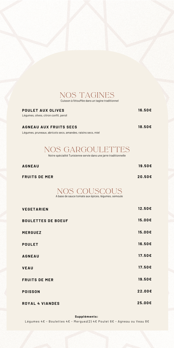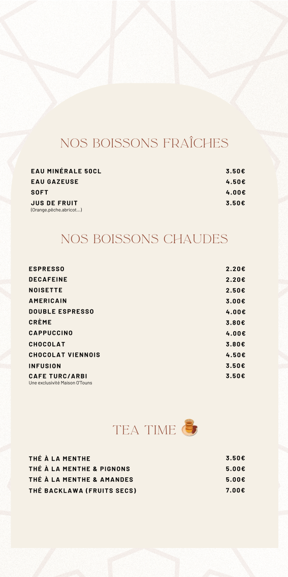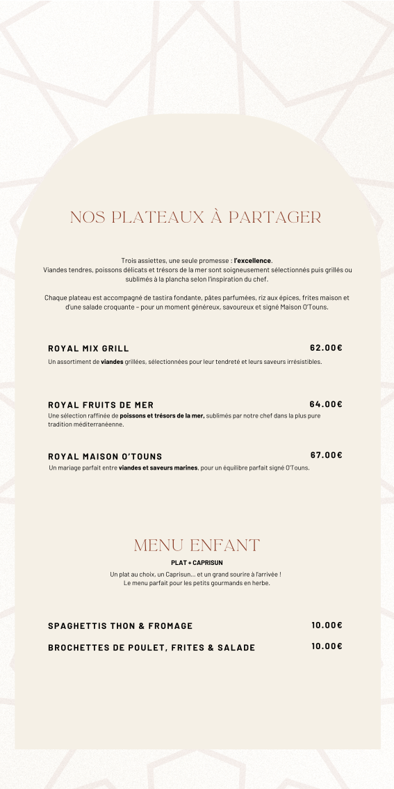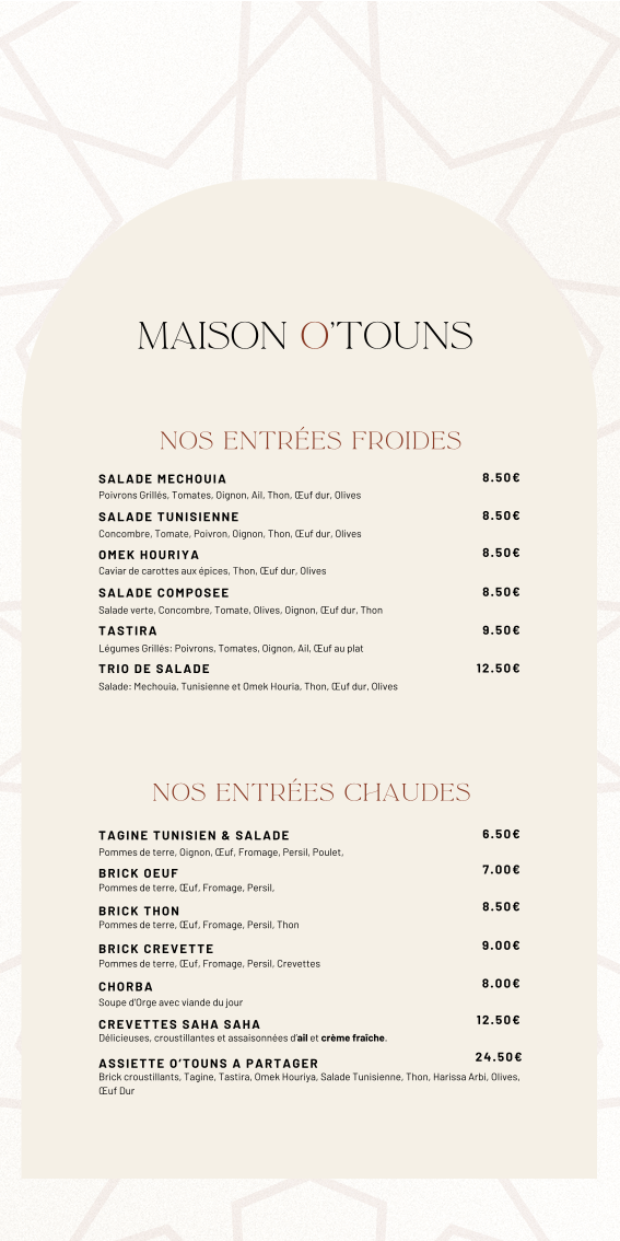 Welcome to Maison O'Touns, a culinary gem nestled in the heart of Nice, France. With its charming location at 1 Rue Bottero, this restaurant specializes in North African cuisine, offering dishes that are deeply flavorful and culturally rich. Patrons rave about the delightful vegetarian options alongside signature dishes like Ojja and Brick, expertly prepared with customizable spice levels.